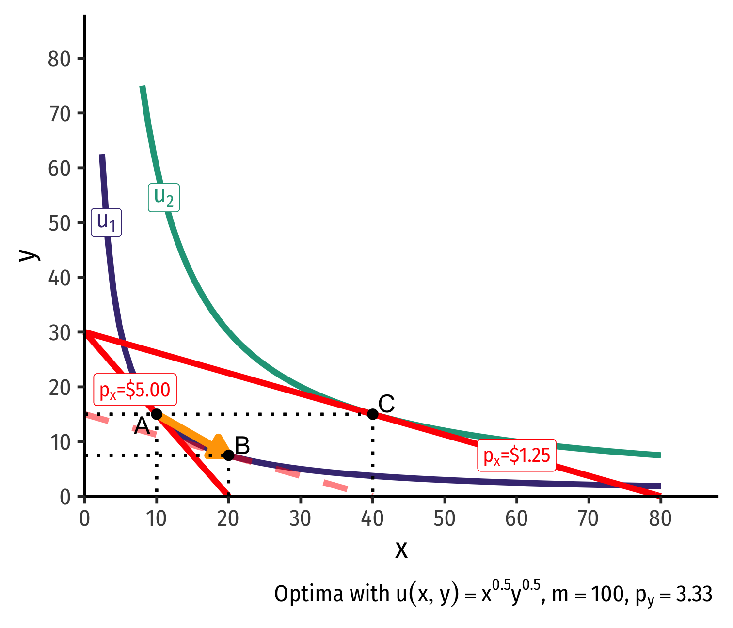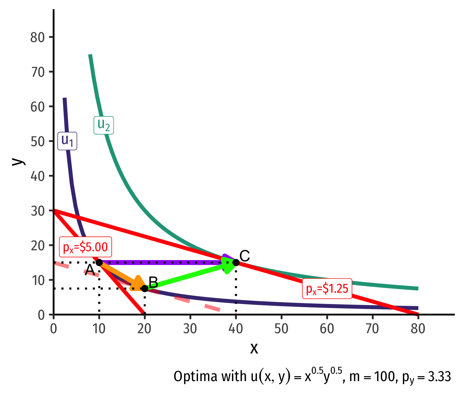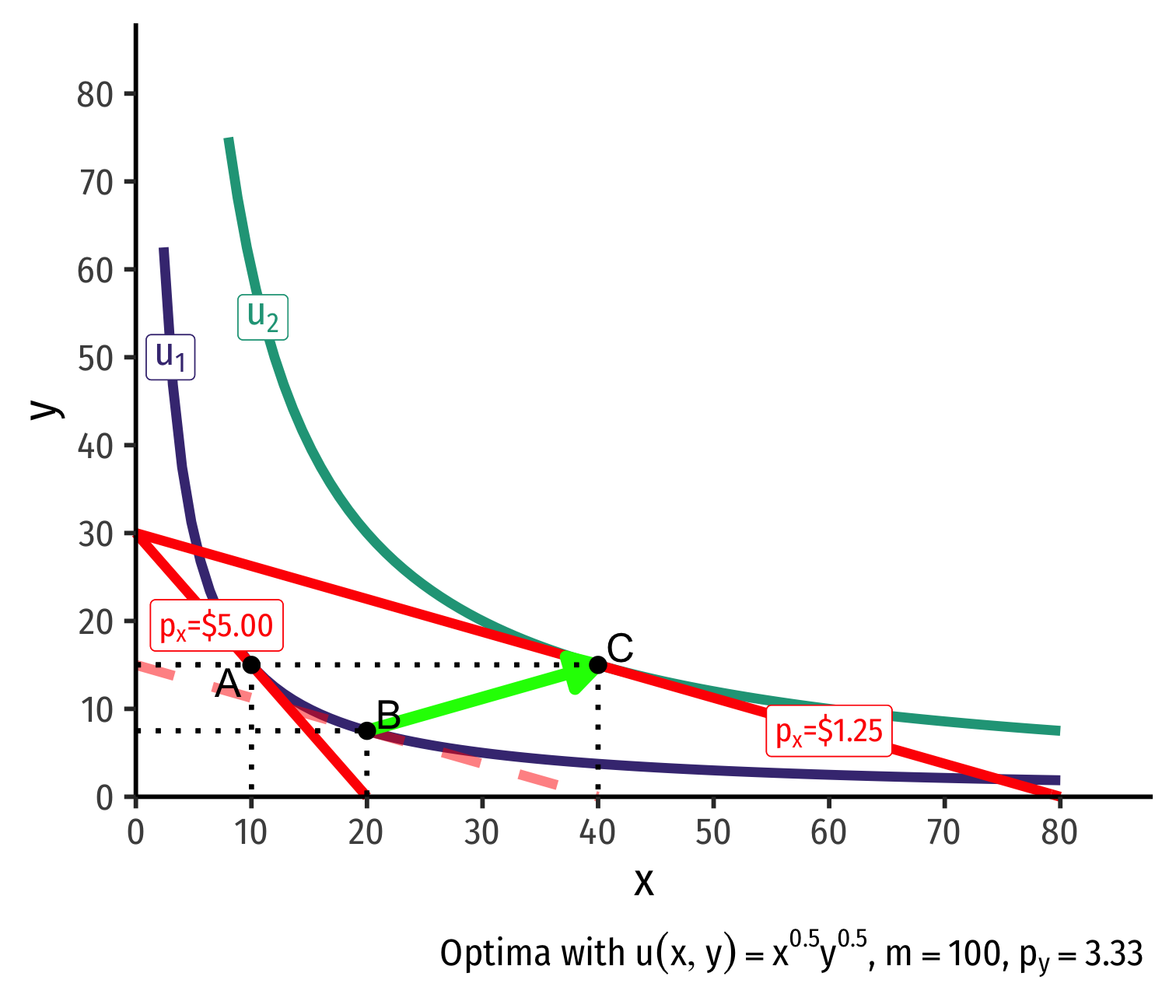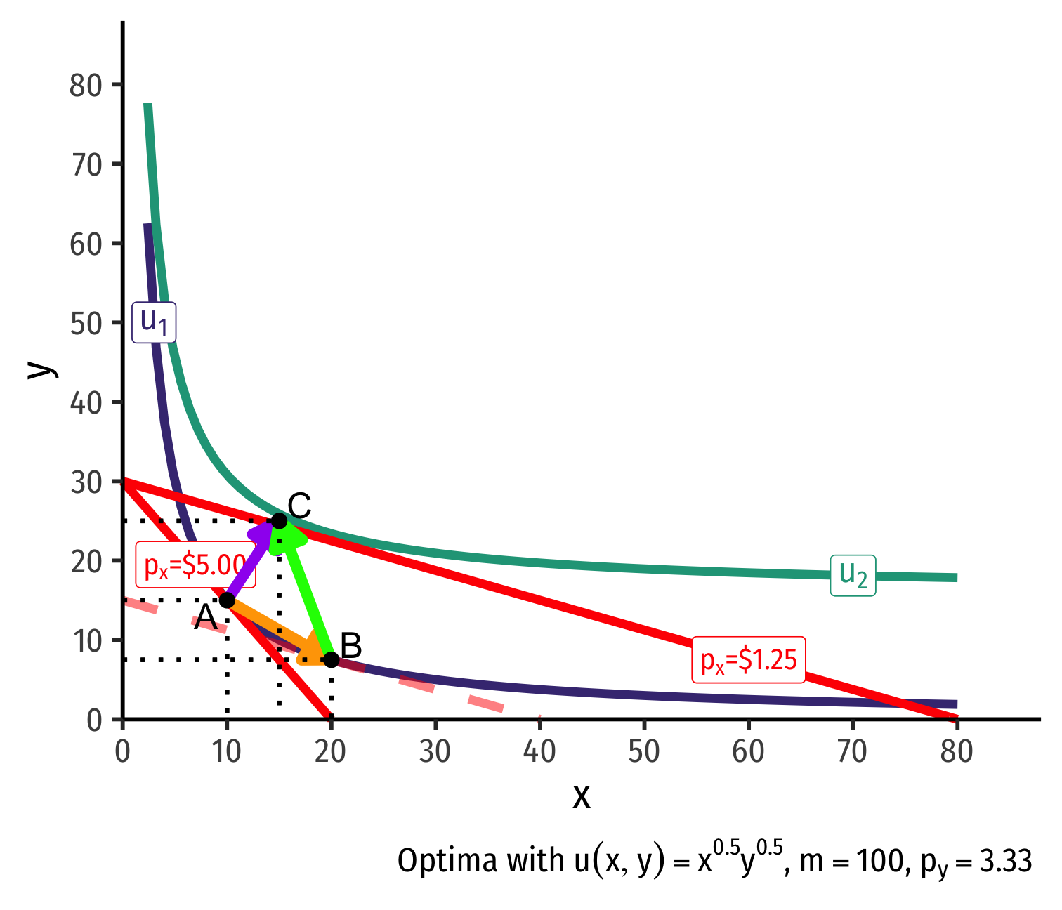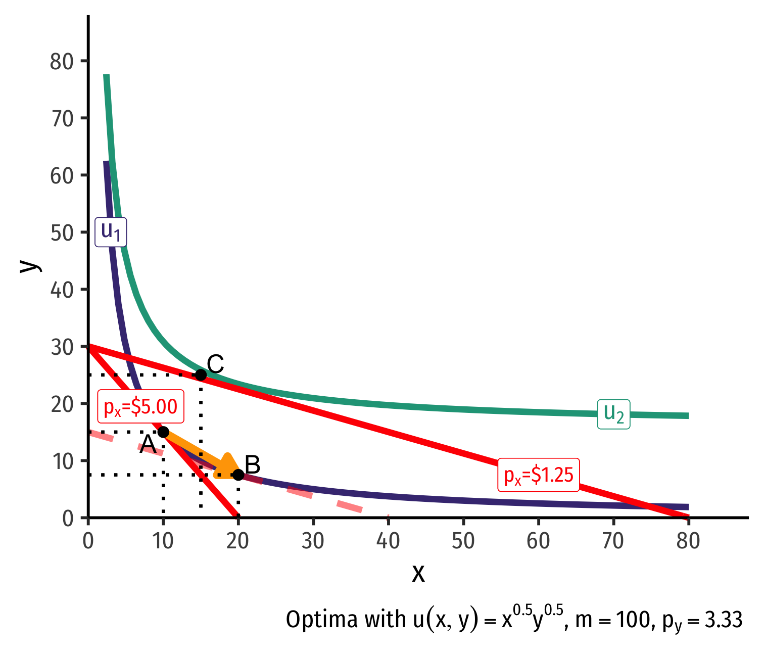 (Real) income effect: B→C to new budget constraint (can buy more of x and/or y)