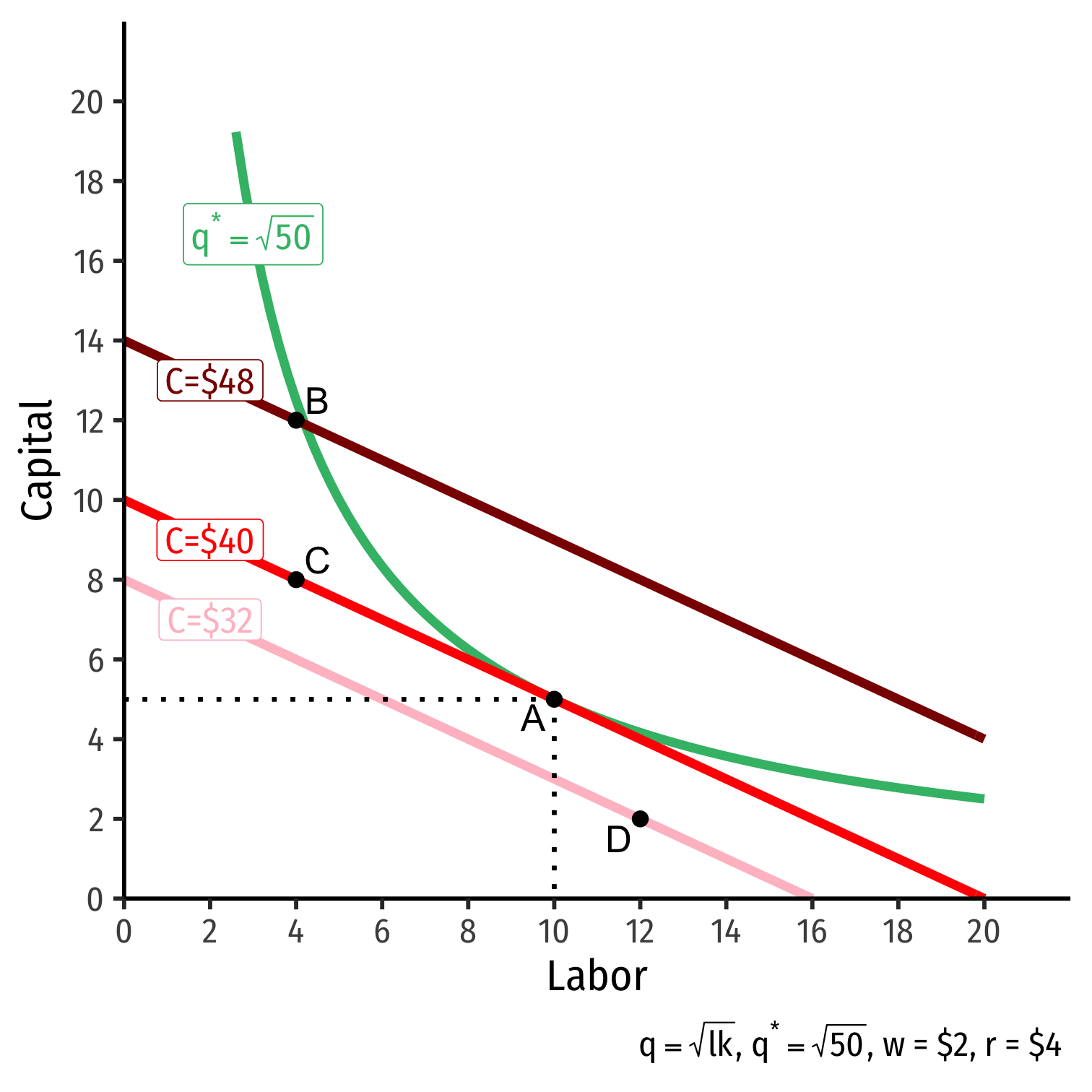 Graphical solution: Lowest isocost line tangent to desired isoquant (A)