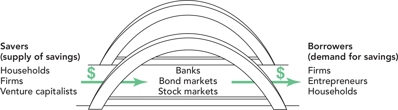 Banks: savers deposit funds in bank (and are paid interest), and bank lends the deposits to borrowers (at higher interest rate)