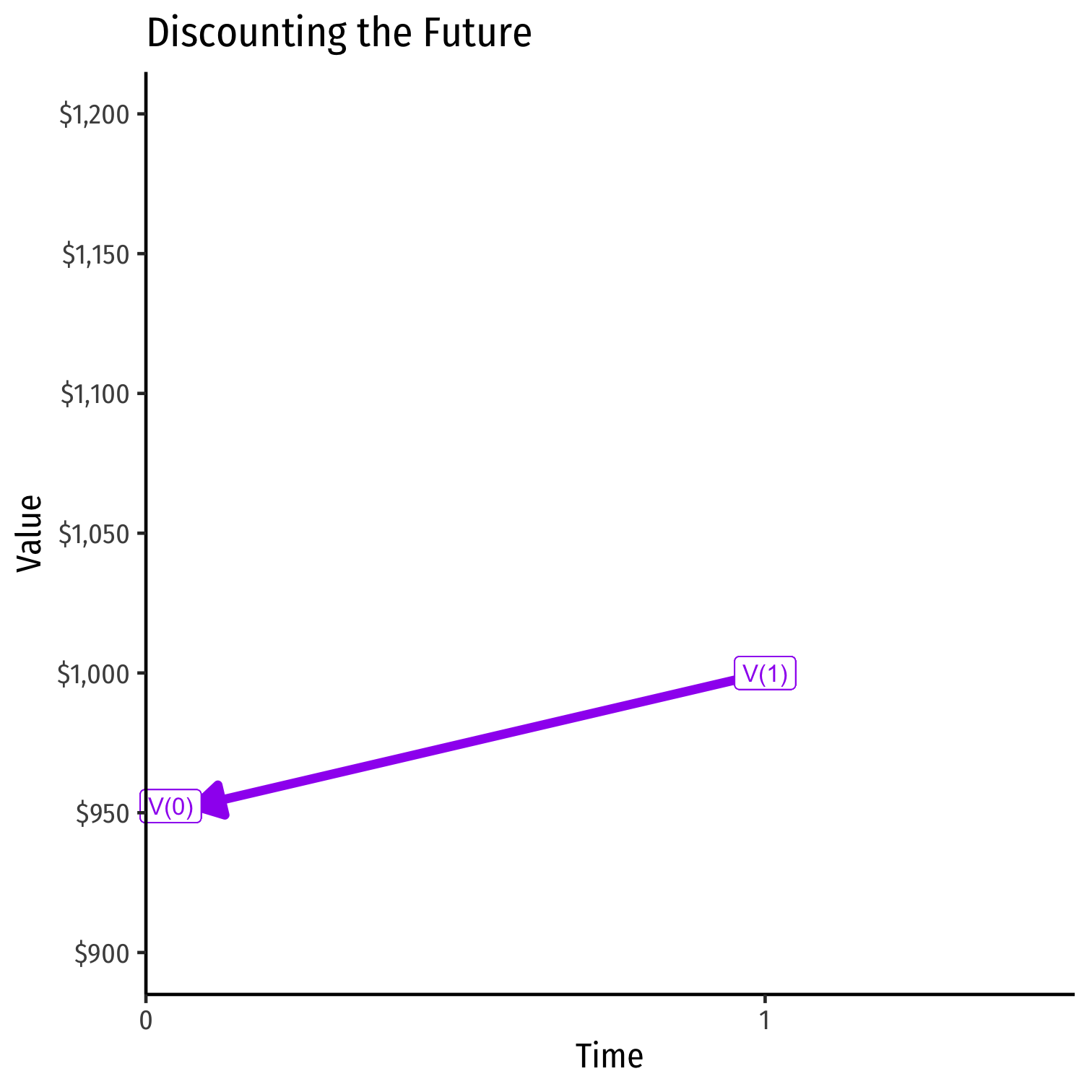 $$\begin{align*} PV &= \frac{FV}{(1+r)^n}\\ PV &= \frac{1000}{(1+0.05)^1}\\ PV &= \frac{1000}{1.05}\\ PV &= \$952.38\\ \end{align*}$$