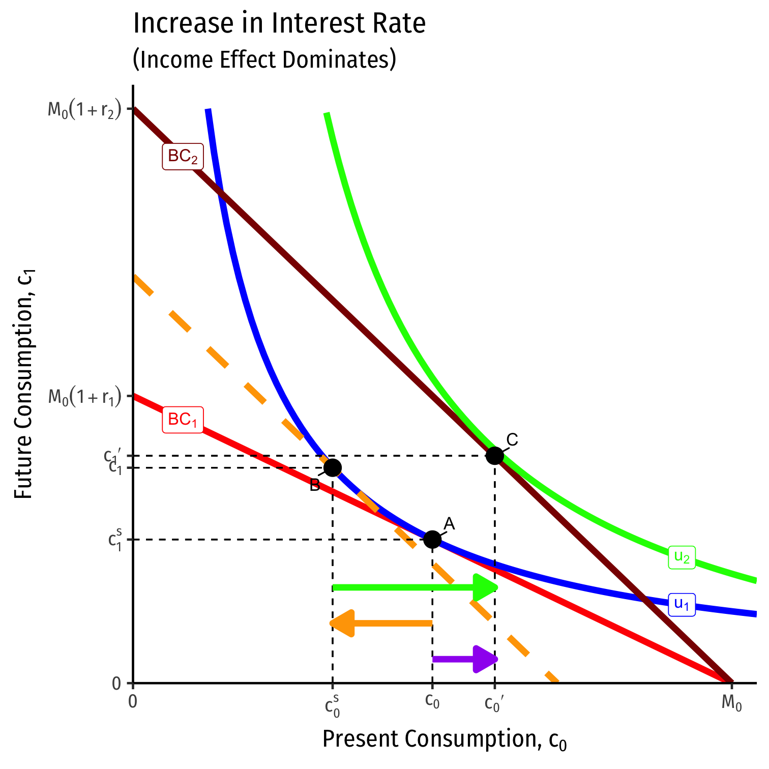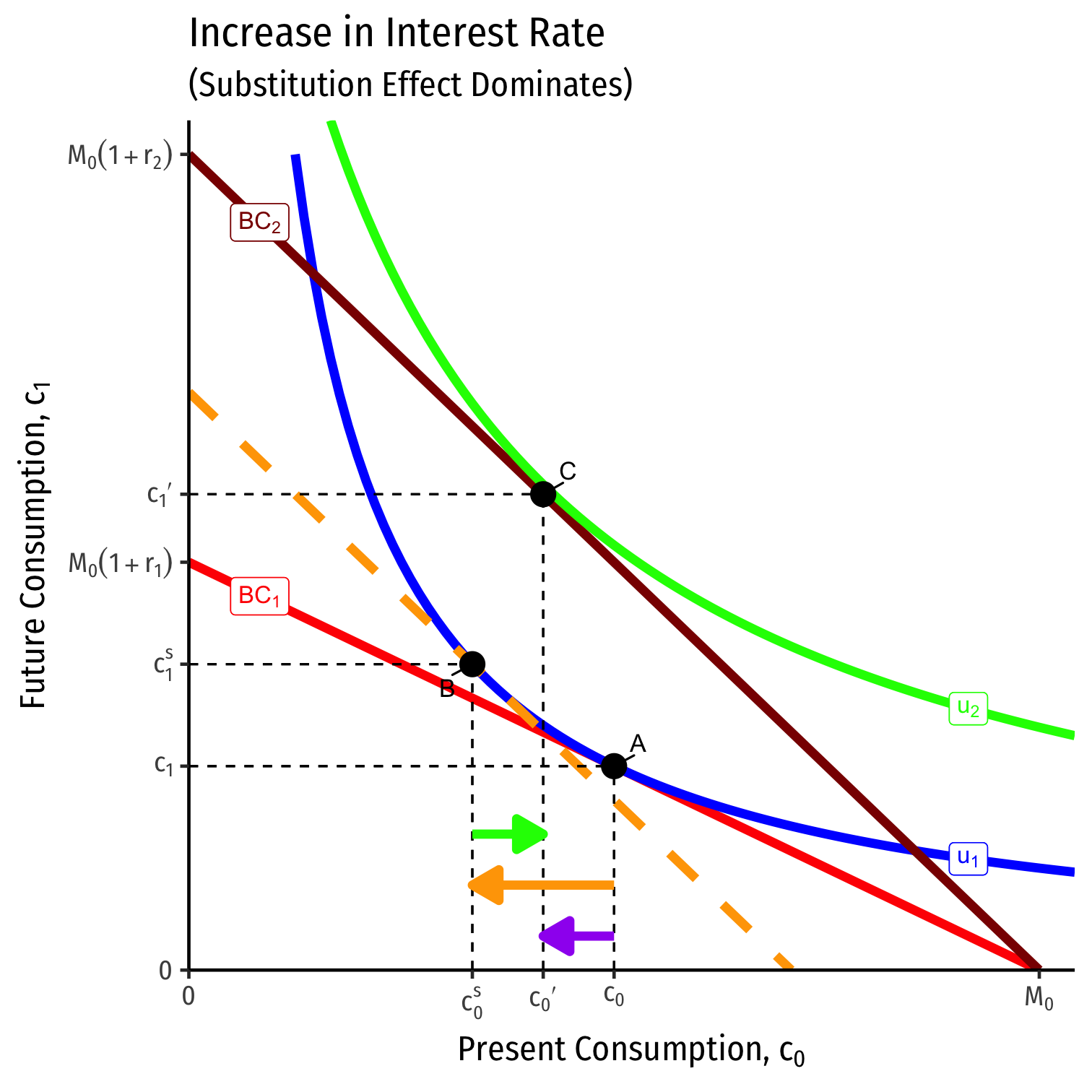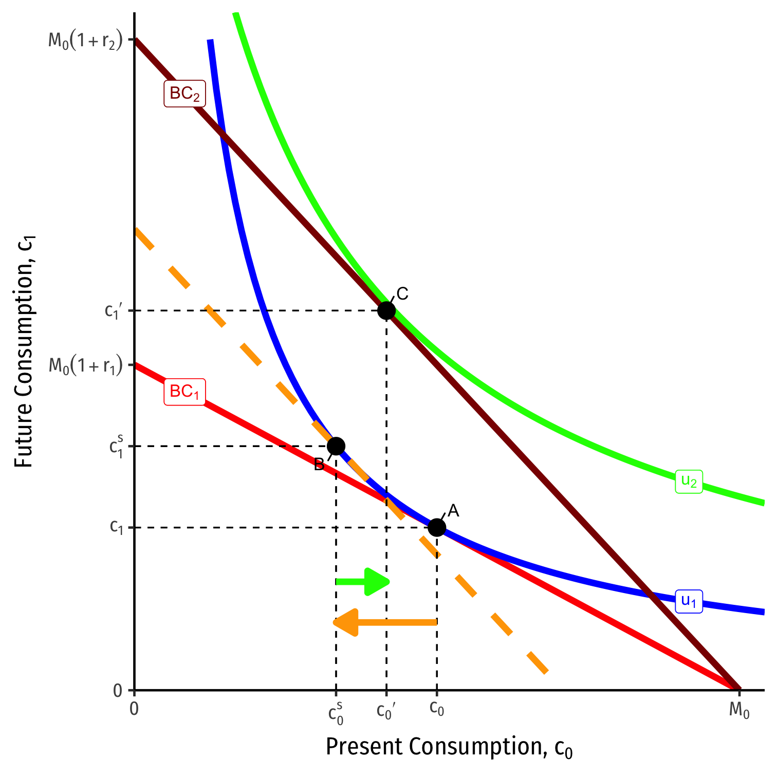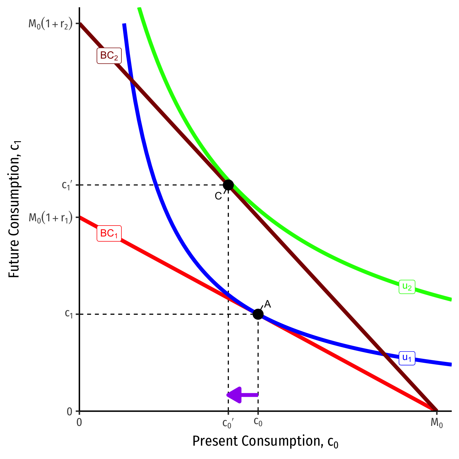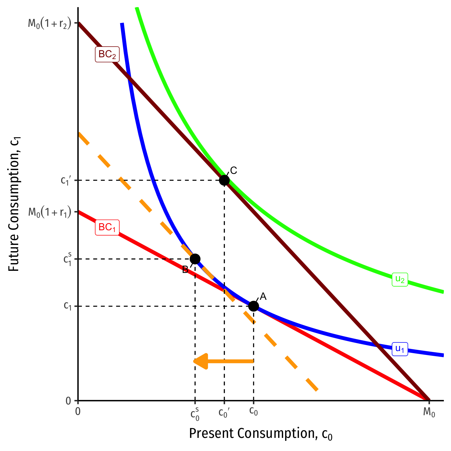 Graphically: under higher rate \(BC_2\), substitute more \(c_1\) for less \(c_0\) (more saving) holding utility constant