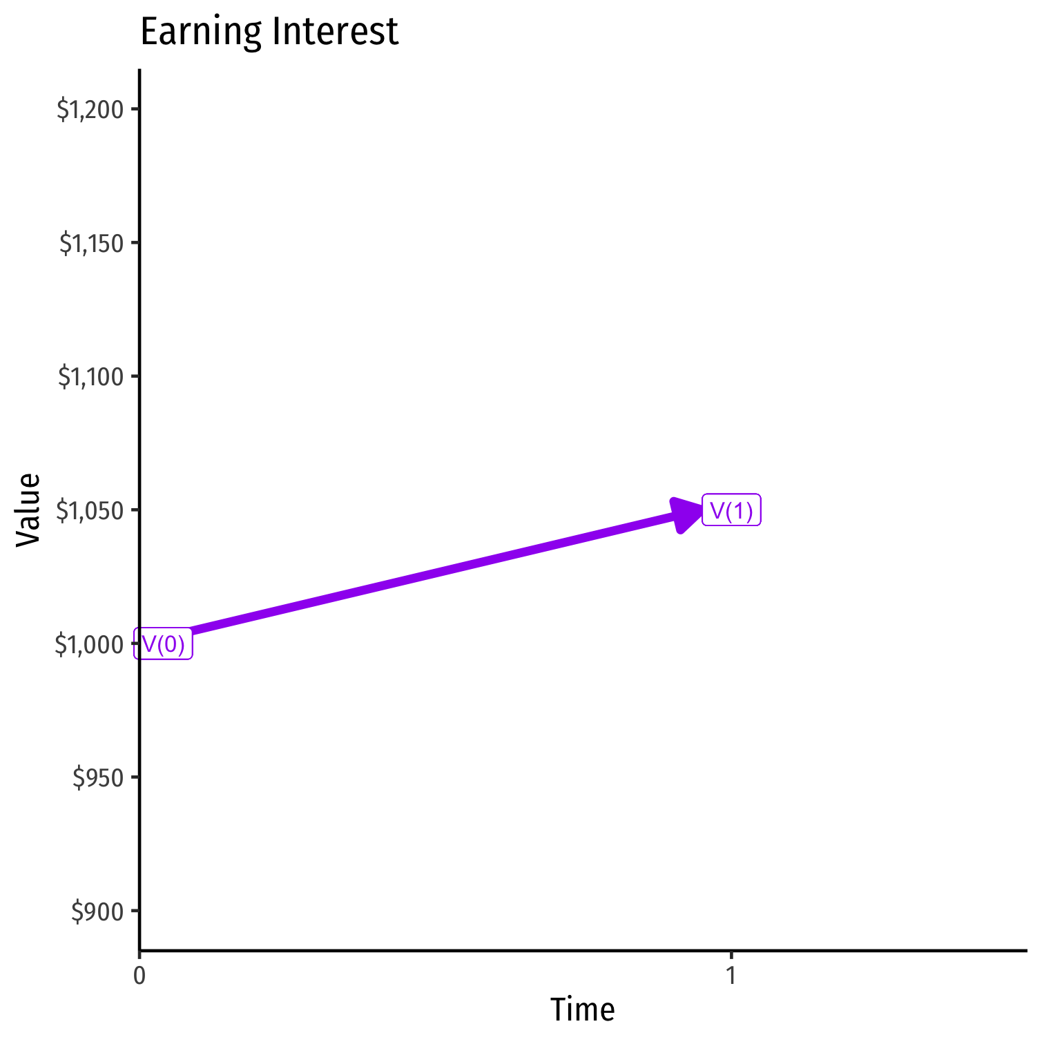 $$\begin{align*} FV &= PV(1+r)^n\\ FV &= 1000(1+0.05)^1\\ FV &= 1000(1.05)\\ FV &= \$1050\\ \end{align*}$$