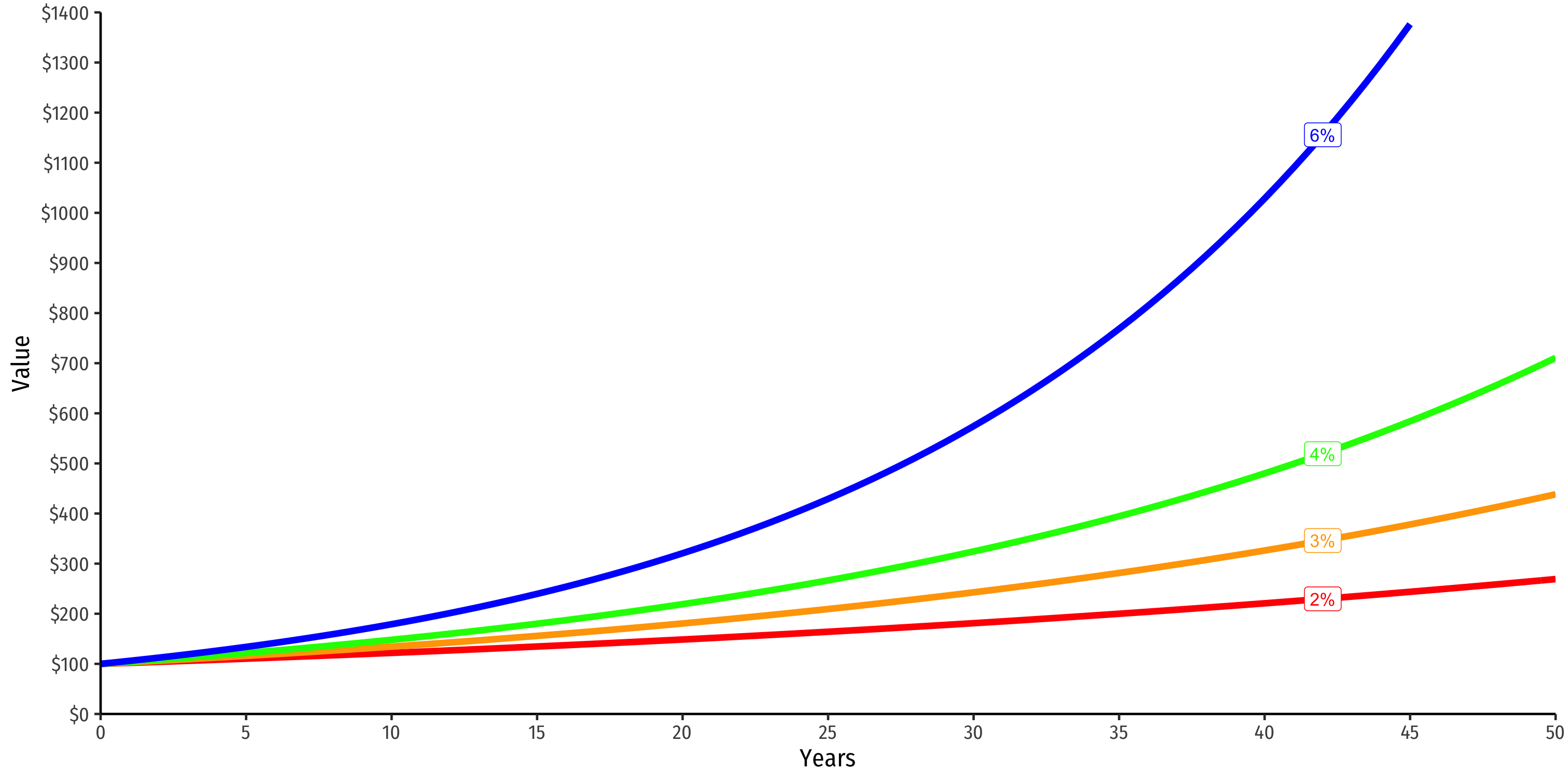 If interest rate is 2%, your money doubles in \(\frac{72}{2}=36\) years